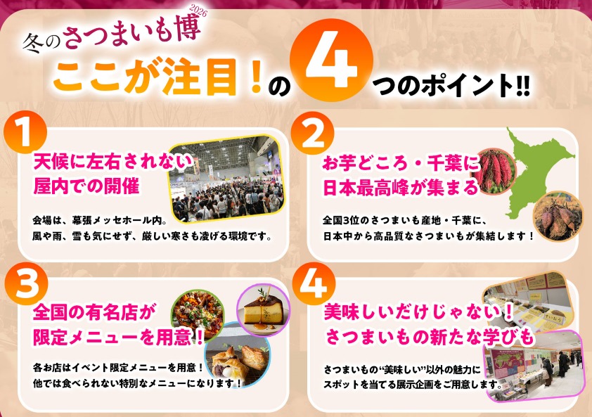 その魅力を思う存分味わえるイベント 「冬のさつまいも博2026」 が、2026年2月に幕張メッセで開催されます。